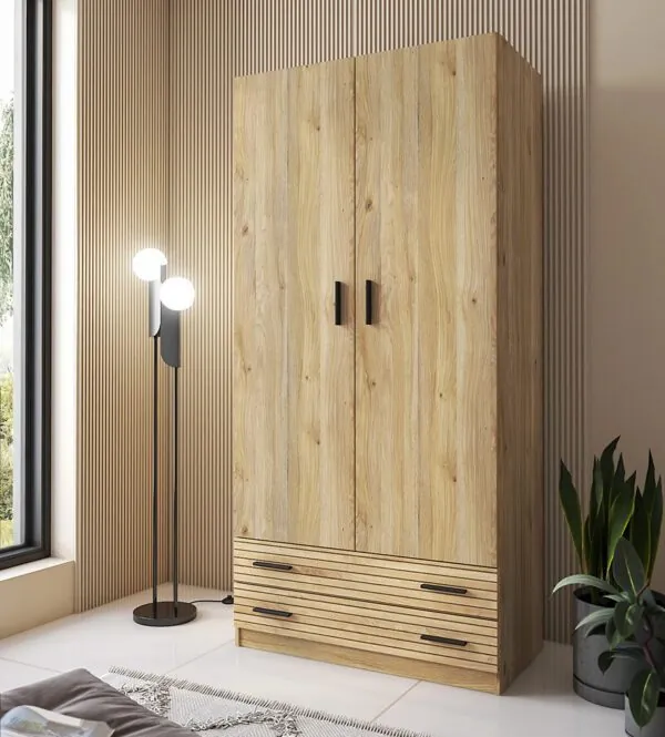 Imagina un dormitorio donde cada prenda tiene su lugar, donde el orden y el estilo se fusionan para crear un santuario de tranquilidad. Con el armario Rapid de 2 puertas y 2 cajones, ese sueño se hace realidad. Este mueble, más allá de ser un simple lugar para guardar ropa, es una declaración de intenciones: un compromiso con la elegancia, la funcionalidad y el aprovechamiento inteligente del espacio. Su diseño Mauvella, acentuado con detalles a rayas, transformará tu habitación, aportando una pincelada de modernidad y sofisticación. Despídete del desorden y da la bienvenida a un ambiente sereno y perfectamente organizado, donde cada mañana será un placer elegir tu atuendo y cada noche, un alivio regresar a un espacio armonioso.