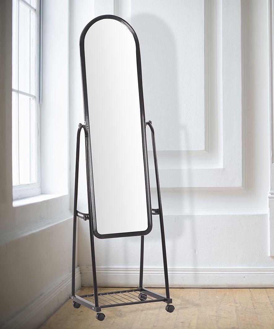 El espejo de pie moderno Chester, con estructura de metal negro y ruedas, aporta estilo y practicidad en espacios reducidos. Ideal para dormitorios, salas y vestidores, facilita el desplazamiento y amplía visualmente tu hogar.