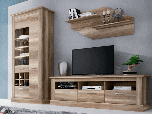 ¿El desorden se ha apoderado de tu salón? ¿Cables a la vista, mandos sin sitio y falta de espacio para tus objetos decorativos? La composición Chellén 01 soluciona estos problemas con una estructura inteligente de 276 cm de ancho. Este conjunto de 3 piezas incluye un robusto mueble de TV de 180 cm con tres cajones y huecos para dispositivos, una vitrina alta con botellero e iluminación LED, y un estante de pared. Disponible en acabados Cañón o Cambria/Blanco, organiza todo tu centro de entretenimiento y lo exhibe con un estilo contemporáneo y limpio.
