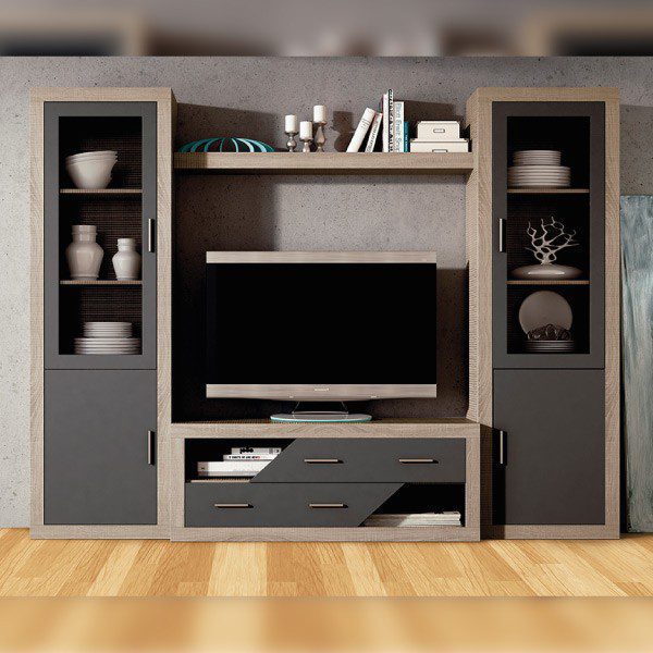 ¿Tu salón es un caos de cables, mandos y objetos sin un lugar fijo? El conjunto de salón completo Lara 05 soluciona este problema de raíz. Se compone de 4 módulos que cubren 250 cm de pared: un mueble bajo para TV de 130 cm con dos cajones, dos vitrinas altas para guardar y exponer, y un estante superior. Su tres acabado disponibles aportan un estilo moderno y coherente, permitiéndote ocultar todo lo que no quieres ver y mantener el orden sin esfuerzo.