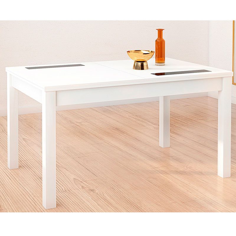 - Estética contemporánea: Acabados en blanco o cambria, líneas limpias y detalles en cristal negro convierten esta mesa comedor extensible en la protagonista de cualquier comedor moderno.